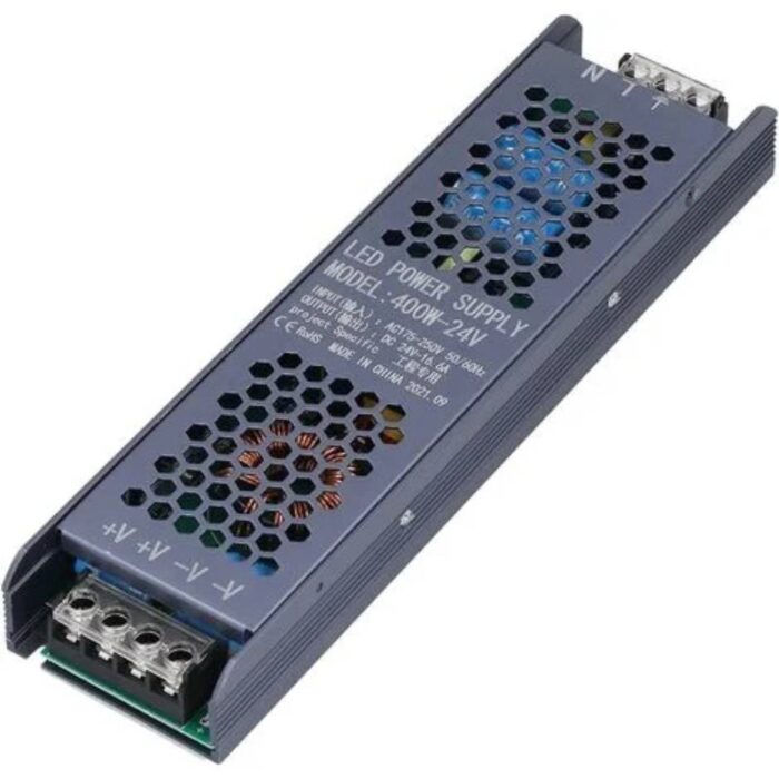 Alimentatore in metallo con uscita a 24V in corrente continua in grado di erogare una potenza di 400W.